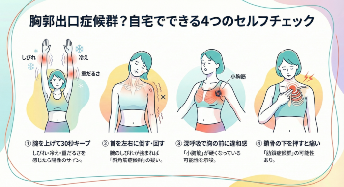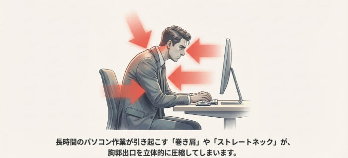 胸郭出口症候群の仕組み・症状のメカニズム・デスクワークとのつながり・チェック方法・悪化要因・放置リスク を、