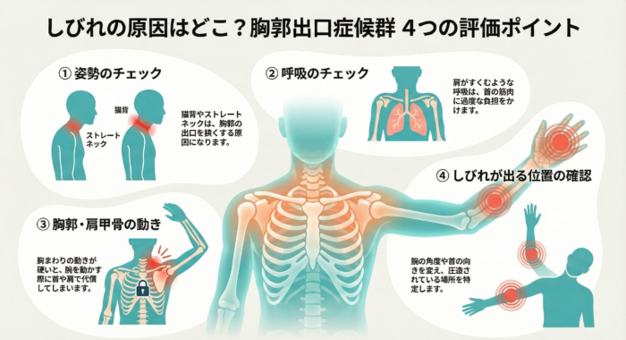 胸郭出口症候群の施術は、神経や血管が「どの場所で」圧迫されているかによって内容が大きく変わります。当院では、施術に入る前に次の4つのポイントを丁寧に評価します。