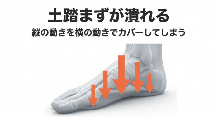 足首が縦に曲がらない分、足を斜め内側に捻じ込むことで、無理やり重心を前に移動させようとするのです。