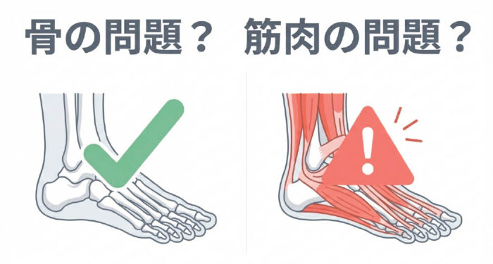 もし、骨に異常がないにもかかわらず痛みが続くのであれば、それは骨の問題ではなく、筋肉や腱、あるいは動作のクセによって炎症が引かない状態、すなわち「腓骨筋腱炎」などの可能性が考えられます。