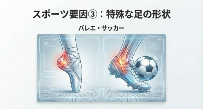 - サッカー: インサイドキックやアウトサイドでのトラップなど、足首を固定した状態でボールの衝撃を受ける動作が多いため、腱の付着部に負担が集中します。