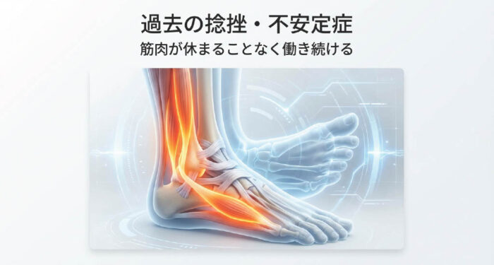 - 捻挫後のリハビリ不足: 過去にひどい捻挫をし、靭帯が緩んだままになっているケースです。不安定な関節を支えるために、脳は「筋肉を固めて守れ」という命令を出します。これにより腓骨筋が休まることなく働き続け、腱に炎症が生じます。