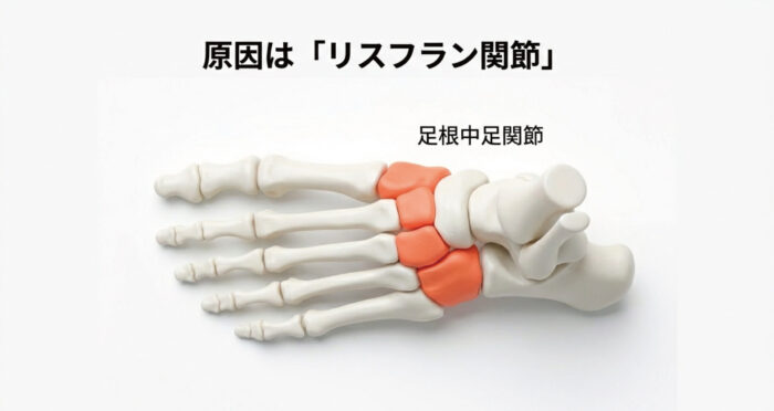 実は、このようなケースでは、単なる打撲や皮膚表面の捻挫ではなく、足のアーチ構造の要(かなめ)である「リスフラン関節」に機能的な問題が生じている可能性があります。