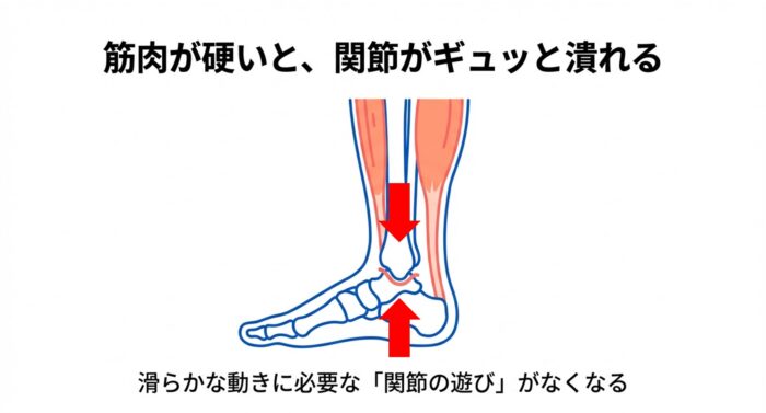 関節が過剰に押し付けられると、本来足首が滑らかに動くために必要な「関節の遊び(ジョイントプレイ)」や、骨がスムーズに転がる「滑り運動」が阻害されてしまいます。