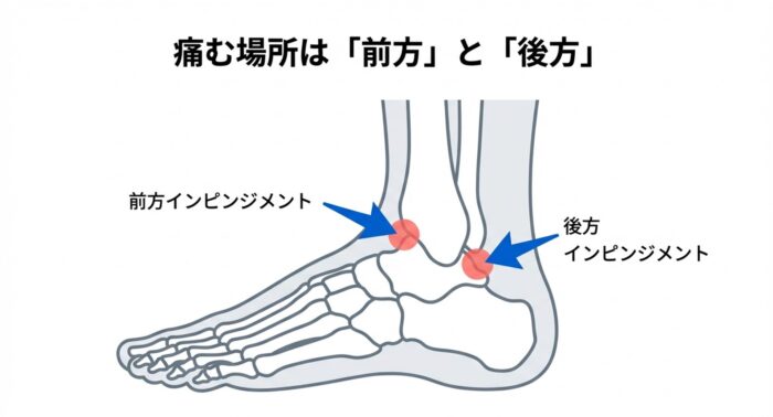 足首を動かした際に、本来ぶつかるべきではない骨や軟部組織(靭帯や関節包、腱など)が衝突したり、挟まり込んだりして強い痛みを引き起こす疾患であり、痛む場所によって大きく「前方」と「後方」に分かれます。