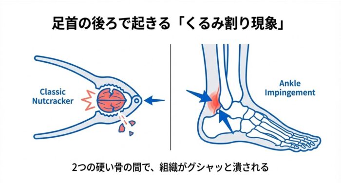 このメカニズムは、スネの骨(脛骨)の後ろのフチと、かかとの骨(踵骨)の上のフチという「2つの硬い骨の間」で、足首の骨(距骨)の後ろ側にある組織が物理的に圧縮・挟み込まれることで発生します。