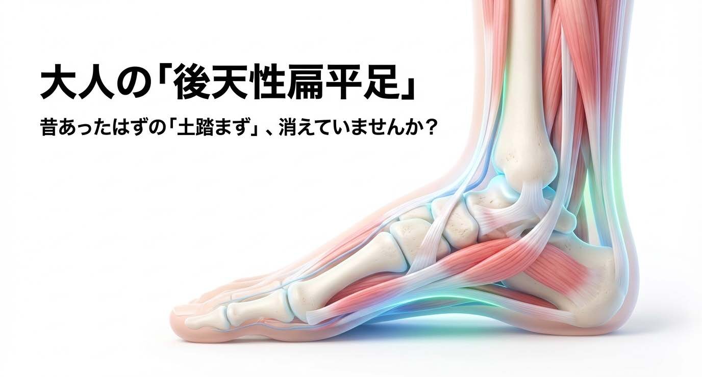 しかし、実はその症状、大人になってから足のアーチ(土踏まず)が少しずつ潰れてしまう「大人の扁平足(後天性扁平足)」が進行しているサインである可能性が高いです。