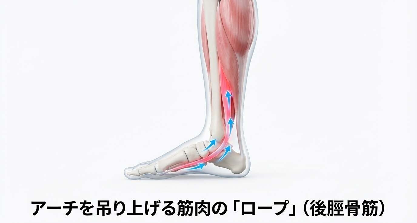 必死にアーチを吊り上げる「ロープ(後脛骨筋)」の悲鳴