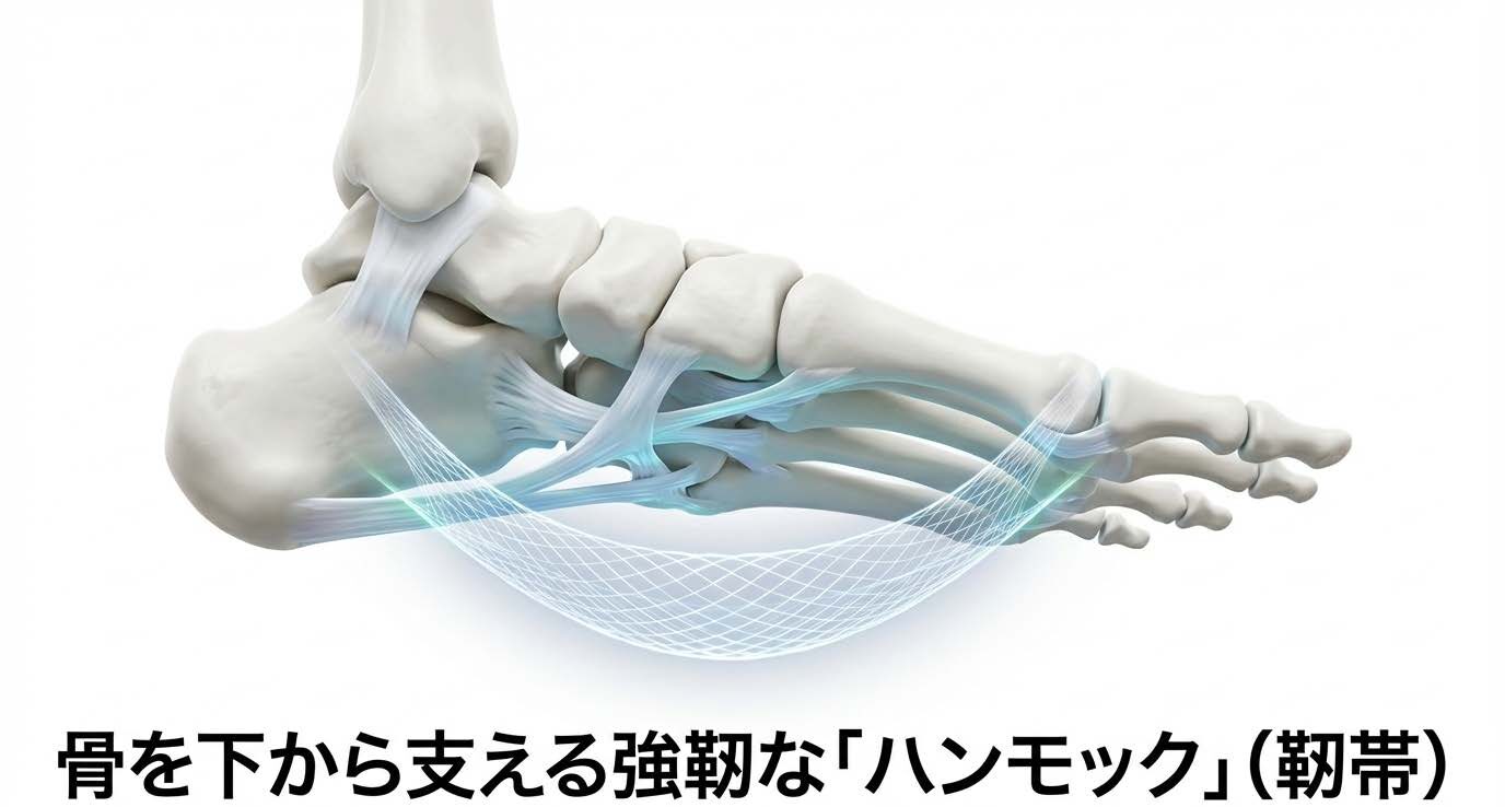 よく「足裏の筋力が落ちたからだ」と言われますが、近年の研究では、筋肉だけではなくその奥にある「強靭なバンド(靭帯)」のトラブルが根本にあると考えられています。足の裏の構造を「ハンモック」と「ロープ」に例えて説明しましょう。